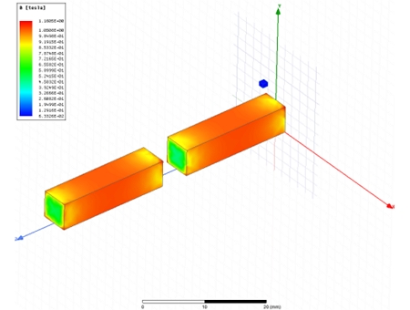Build the setup in ANSYS Maxwell—two sintered Neodymium magnets, defined spacing. Properties: Assign Br = 1.3T, set magnetization direction.